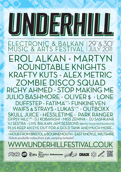 A new up-and-coming festival located slap-bang in between Bristol and Bournemouth is Underhill – two days and nights of the finest electronic and Balkan talent appearing from 29th July to 31st July, Ridgewood Park, East Knoyle, in Wiltshire.