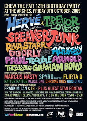 Chew The Fat’s 12th Birthday Party is here with three rooms of eclectic sounds, all rather on the banging side: With Herve, Trevor Loveys, Riva Starr and Doorly in the main room and Marcus Nasty, Spyro and the Urban Nerds crew in room 2. Pelski’s pick of the bunch would be Riva Starr, who smashed Bestival’s Bollywood Tent to pieces.